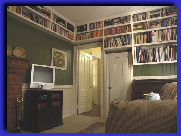 Clever use of shelving allows book storage that is out of the way,